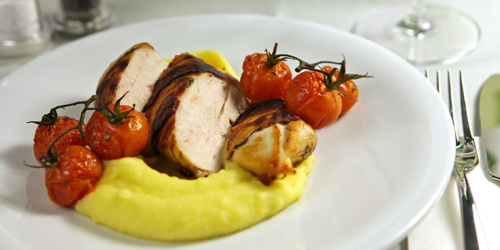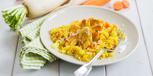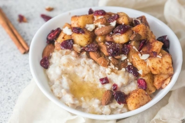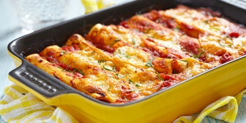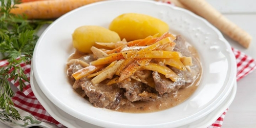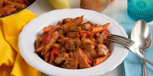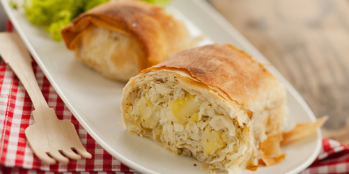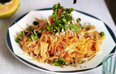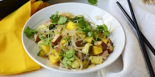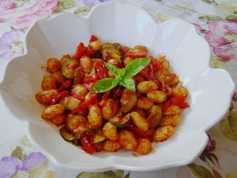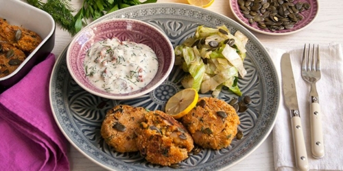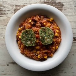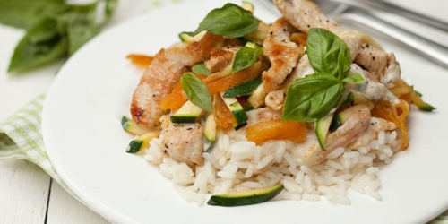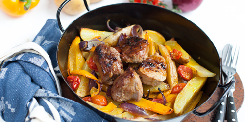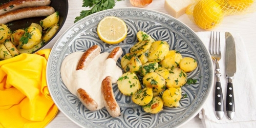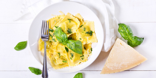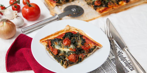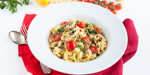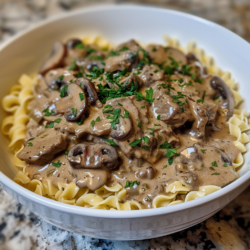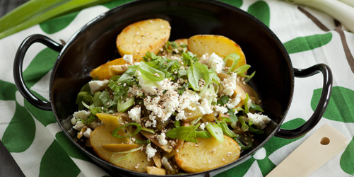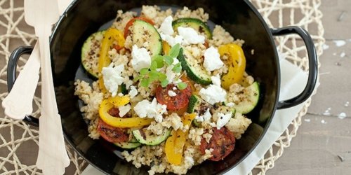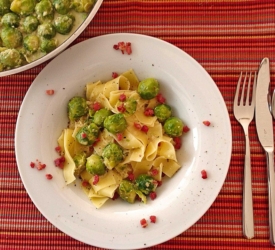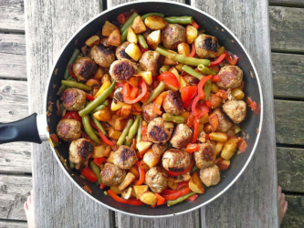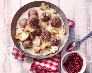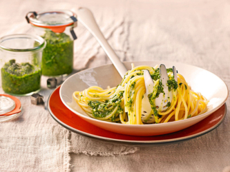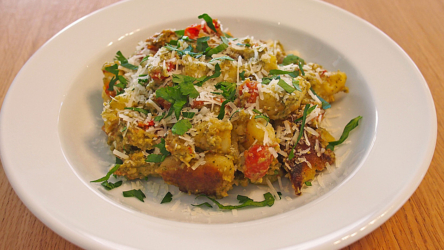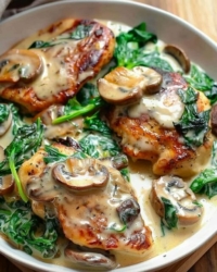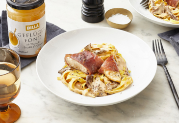 Babyspinat-Spätzle-Pfanne mit Champignons in cremiger Soße, getoppt mit gerösteten Walnüssen